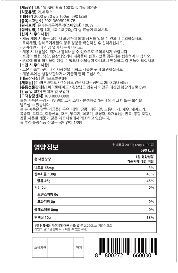파이토메이드 1포1알 NFC 착즙 100% 유기농 레몬즙 20g 100포, 1개